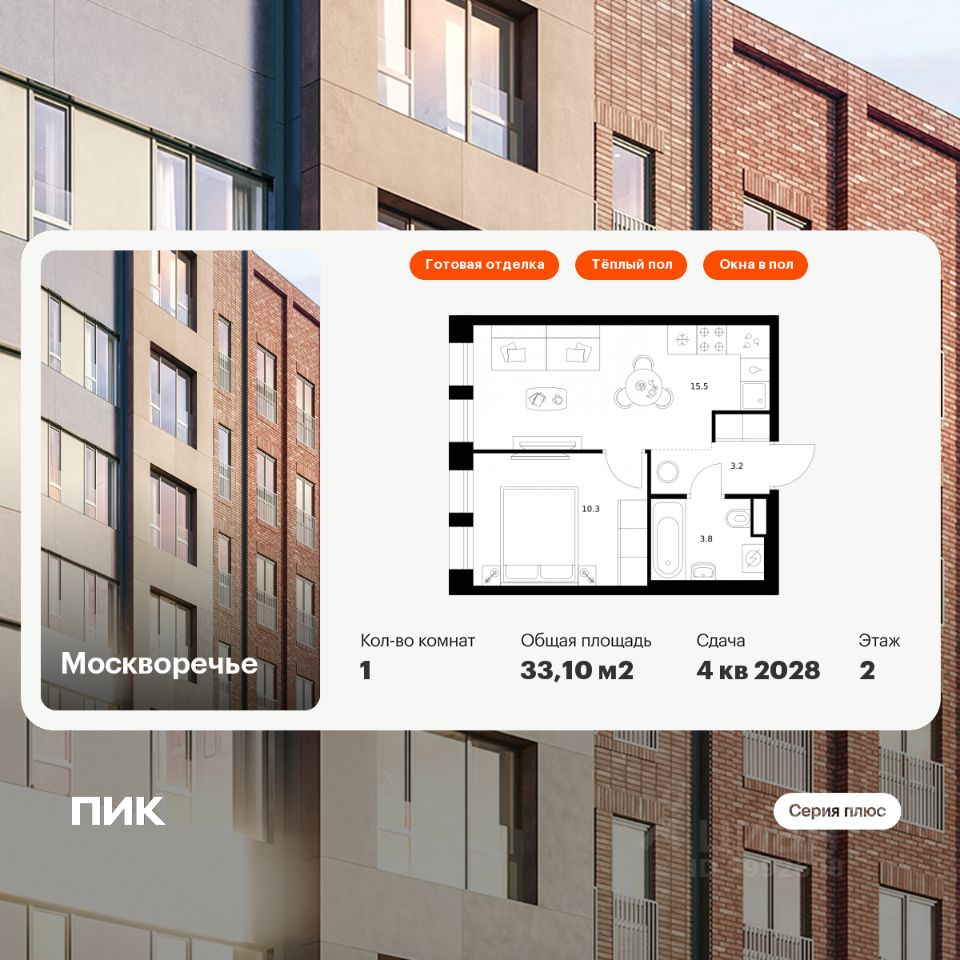 Продаётся 1-комн. квартира площадью 33,1 кв.м на 12 этаже 12 этажного дома (Корпус 2.3, Секция 4) проекта ПИК Москворечье. Светлый просторный подъезд на уровне земли, функциональная планировка, большие окна, c отделкой.