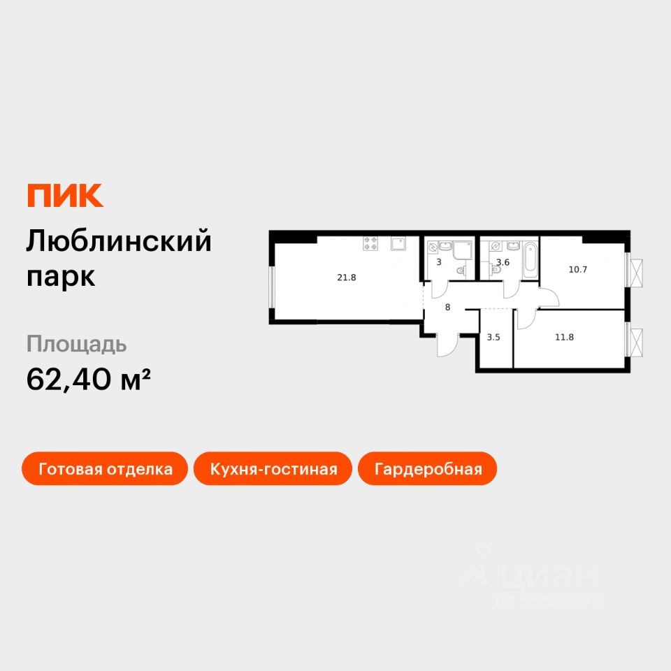 Продаётся 2-комн. квартира площадью 62,4 кв.м на 2 этаже 25 этажного дома (Корпус 12, Секция 5) проекта ПИК Люблинский парк. Светлый просторный подъезд на уровне земли, функциональная планировка, большие окна, c отделкой.