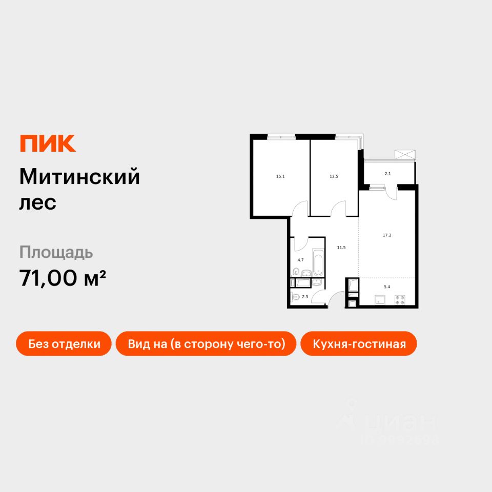 Продаётся 2-комн. квартира площадью 71 кв.м на 19 этаже 24 этажного дома (Корпус 15.1, Секция 1) проекта ПИК Митинский лес. Светлый просторный подъезд на уровне земли, функциональная планировка, большие окна, без отделки.
