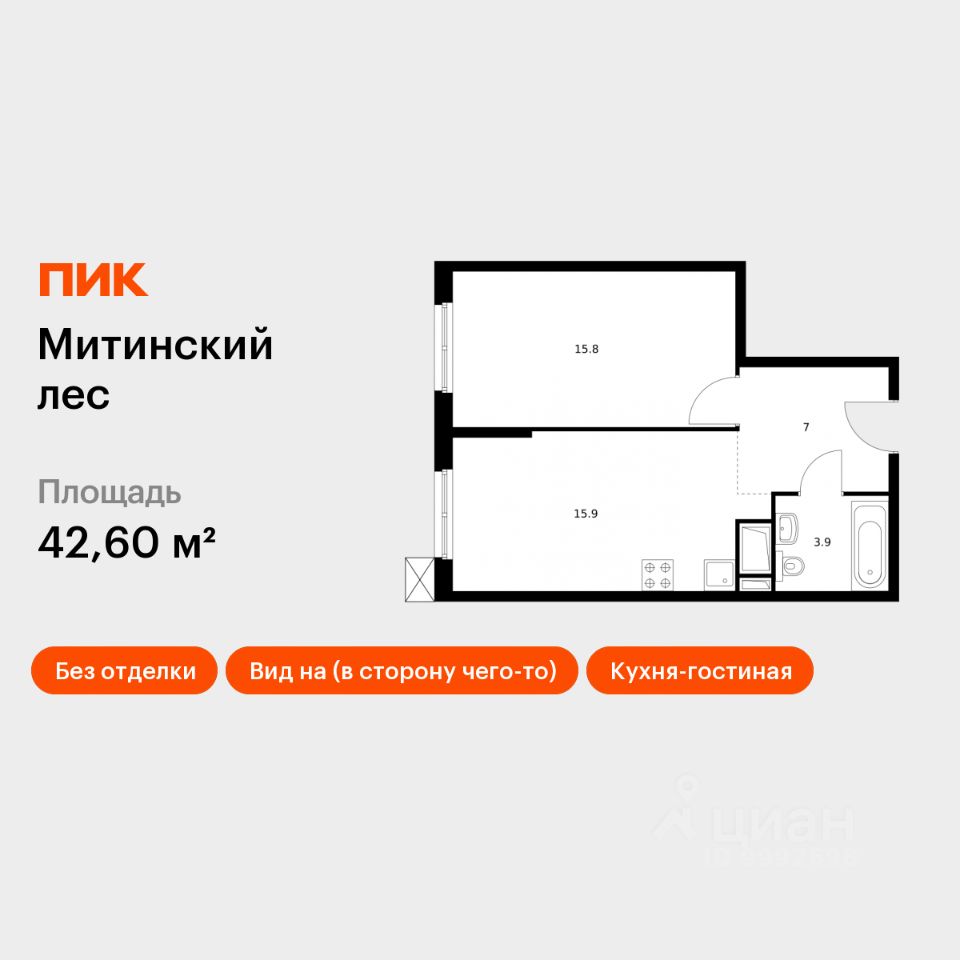Продаётся 1-комн. квартира площадью 42,6 кв.м на 19 этаже 24 этажного дома (Корпус 15.1, Секция 1) проекта ПИК Митинский лес. Светлый просторный подъезд на уровне земли, функциональная планировка, большие окна, без отделки.