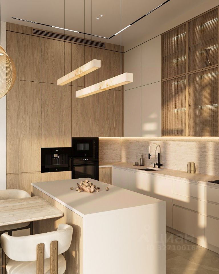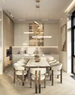 Большая кухня-гостиная 42м2 (встроенные индукционная варочная панель Kuppersbusch, духовой шкаф с СВЧ Kuppersbusch, кофемашина Kuppersbusch, посудомоечная машина Kuppersbusch, встраиваемый холодильник Liebherr, встраиваемый морозильник Liebherr, винный шкаф Liebherr) с мягкой зоной