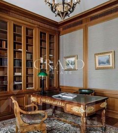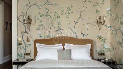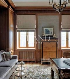 Уникальные элементы отделки включают мрамор в санузлах, панели из красного дерева в кабинете и шелковые обои ручной работы в спальне. Интерьер обогащен подлинными артефактами, такими как гобелен XVIII века и антикварные люстры, которые соседствуют с современной системой приточно-вытяжной вентиляции с климат-контролем.