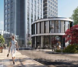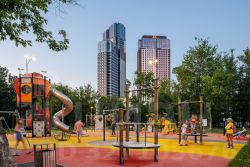 Внешняя территория комплекса разделена на три зоны. Открытая входная группа объединяет кофейню, аптеку и салон красоты. Закрытый внутренний двор с уютными скамейками, шезлонгами и качелями создаёт атмосферу неторопливого отдыха. В восточной части - игровые и спортивные площадки для всех возрастов, вдохновлённые атмосферой детских фильмов.
