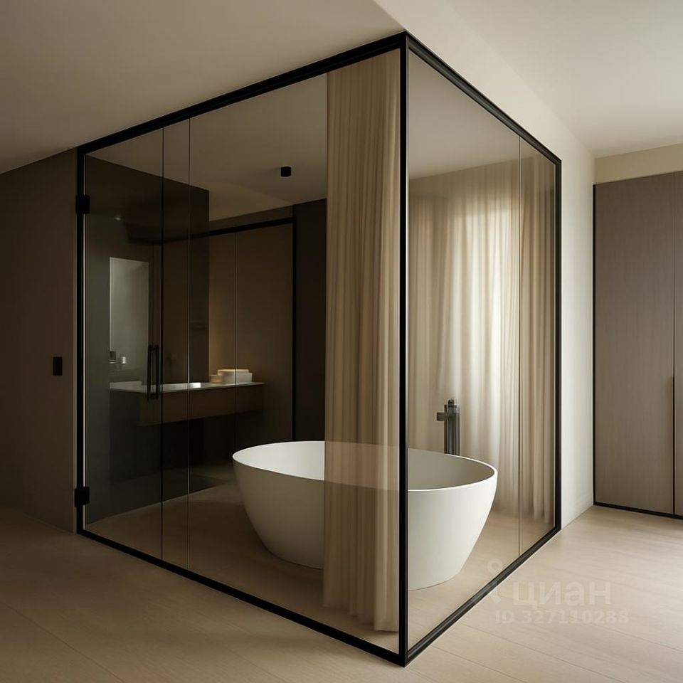 Ванная комната как арт-объект: Стеклянная перегородка, которая превращает ванную в настоящий элемент искусства.