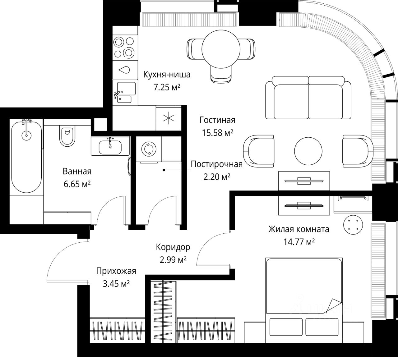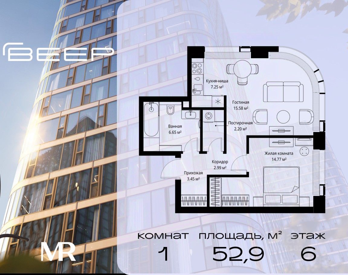 Продаётся 1-комнатная квартира общей площадью 52.89 м² без отделки в ЖК Веер на 6-м этаже 35 этажного дома.