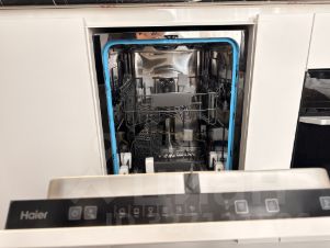 Вся техника установлена фирмы HAIER: варочная панель, вытяжка, духовой шкаф с функцией СВЧ, посудомоечная машина, холодильник, измельчитель, стирально-сушильная машина.