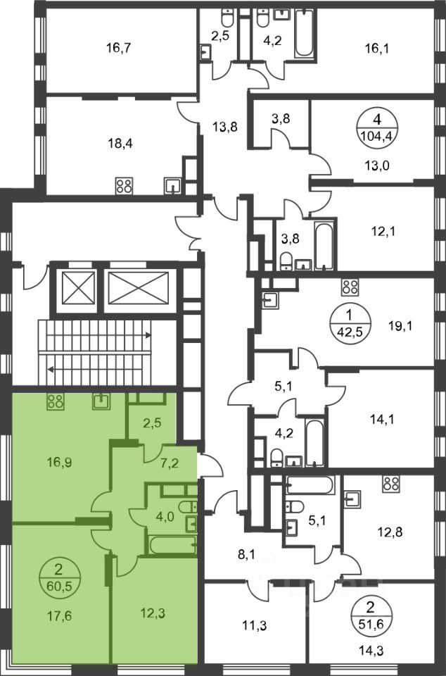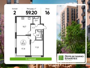 Общая площадь квартиры - 59,2 кв. м, этаж 16 из 17.