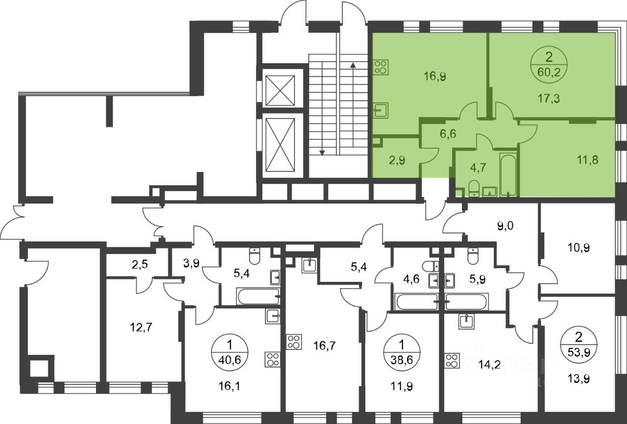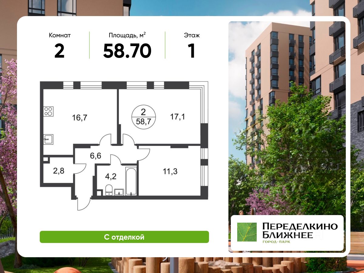 Общая площадь квартиры - 58,7 кв. м, этаж 1 из 17.