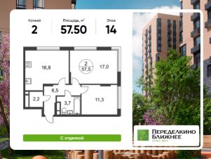 Общая площадь квартиры - 57,5 кв. м, этаж 14 из 17.