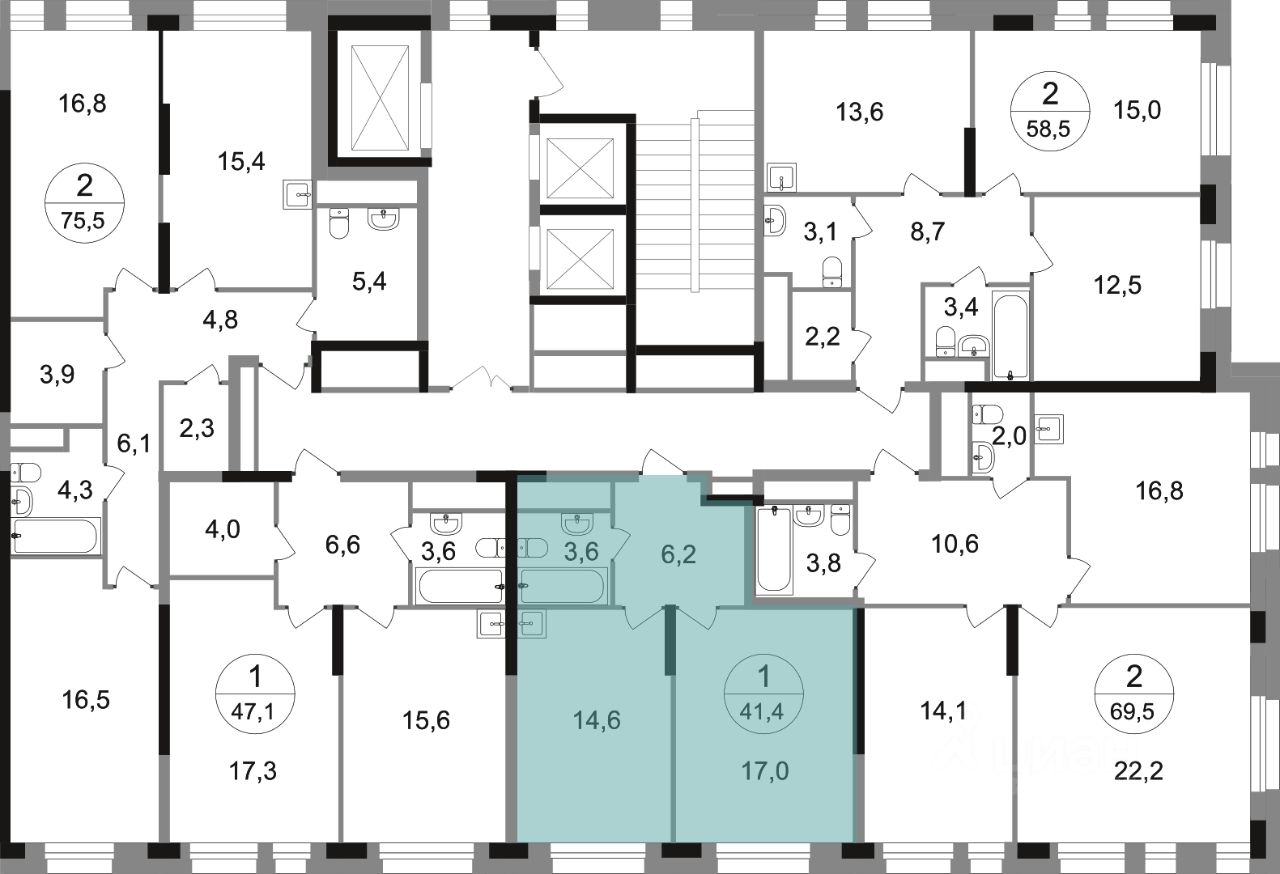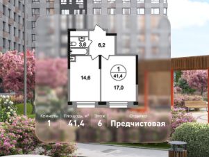 Общая площадь квартиры - 41,4 кв. м, этаж 6 из 22.