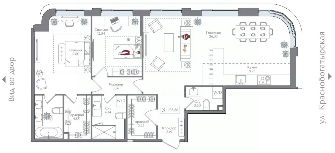Квартира на 9 этаже в жилом комплексе премиум-класса "Преображенская площадь". Общая площадь: 108.88 кв.м.