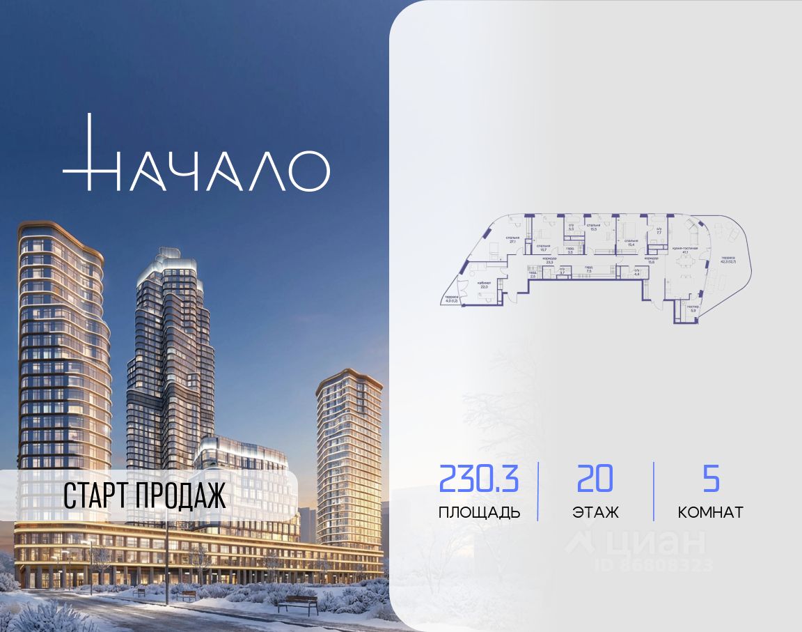 В престижном районе Пресня, на перекрестке делового и исторического центров Москвы, продается многокомнатная квартира площадью 230.30 кв. м без отделки. Квартира находится на 20 этаже 24-этажного дома, в новом элитном жилом комплексе "Начало" от девелопера "Донстрой". Реализация проекта запланирована на 1 квартал 2030 года.