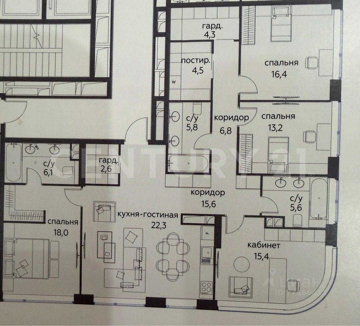 Функциональная планировка: кухня-гостиная, 4 пальни, 3 санузла, 3 гардеробные.
