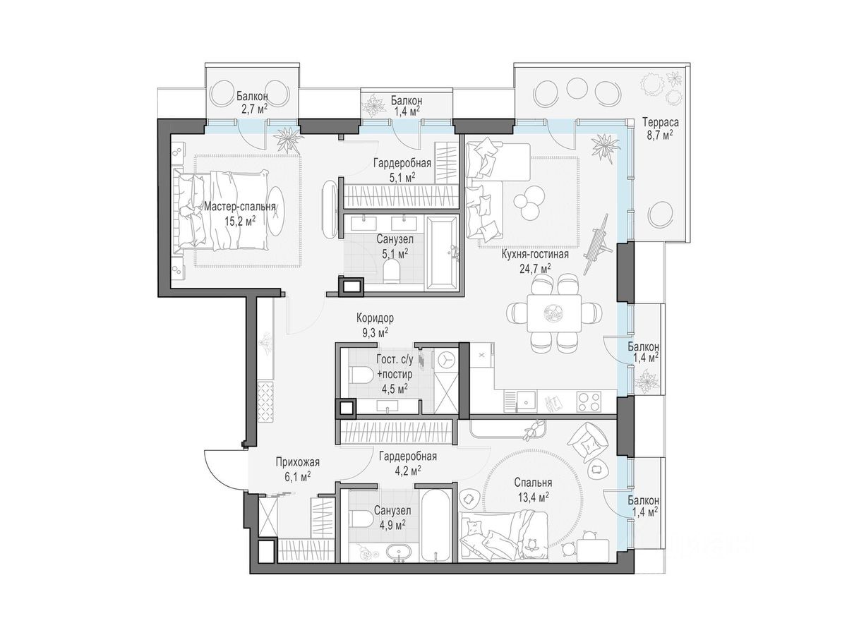 Общая площадь квартиры - 96.70 кв.м.