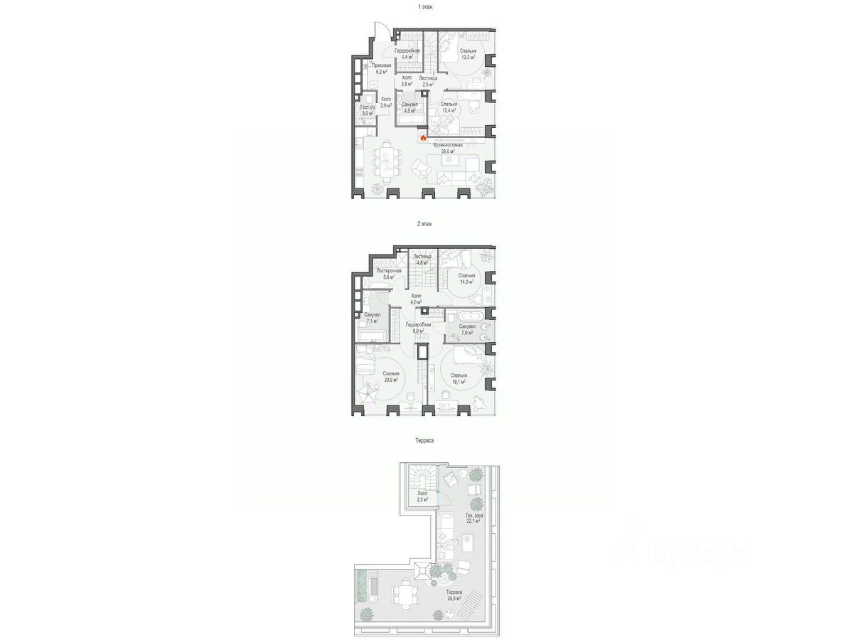 Роскошный двухэтажный пентхаус с собственной террасой, откуда открывается вид на исторический центр Москвы. Площадь 180 кв. м позволяет с комфортом расположить четыре спальни и кухню-гостиную. Гостиная с камином и панорамными видами станет точкой притяжения всей семьи. Сценарии времяпрепровождения и отдыха на просторной террасе, площадью 50,6 кв. м разнообразны: обеденная зона, лаундж-пространство, лежаки для принятия солнечных ванн.