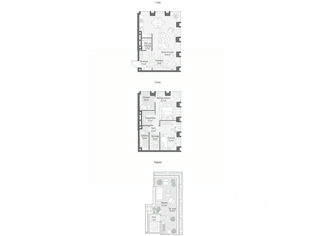 Просторный пентхаус 108,2 кв. м с личной террасой, площадью 28,1 кв. м. Из окон кухни-гостиной (44,6 кв. м) как на ладони открывается исторический центр Москвы. Большие панорамные окна и высокие потолки создают пространство, наполненное светом. Особенно прекрасен он в вечернее время, когда под звёздным небом подсвечиваются знаковые объекты столицы.