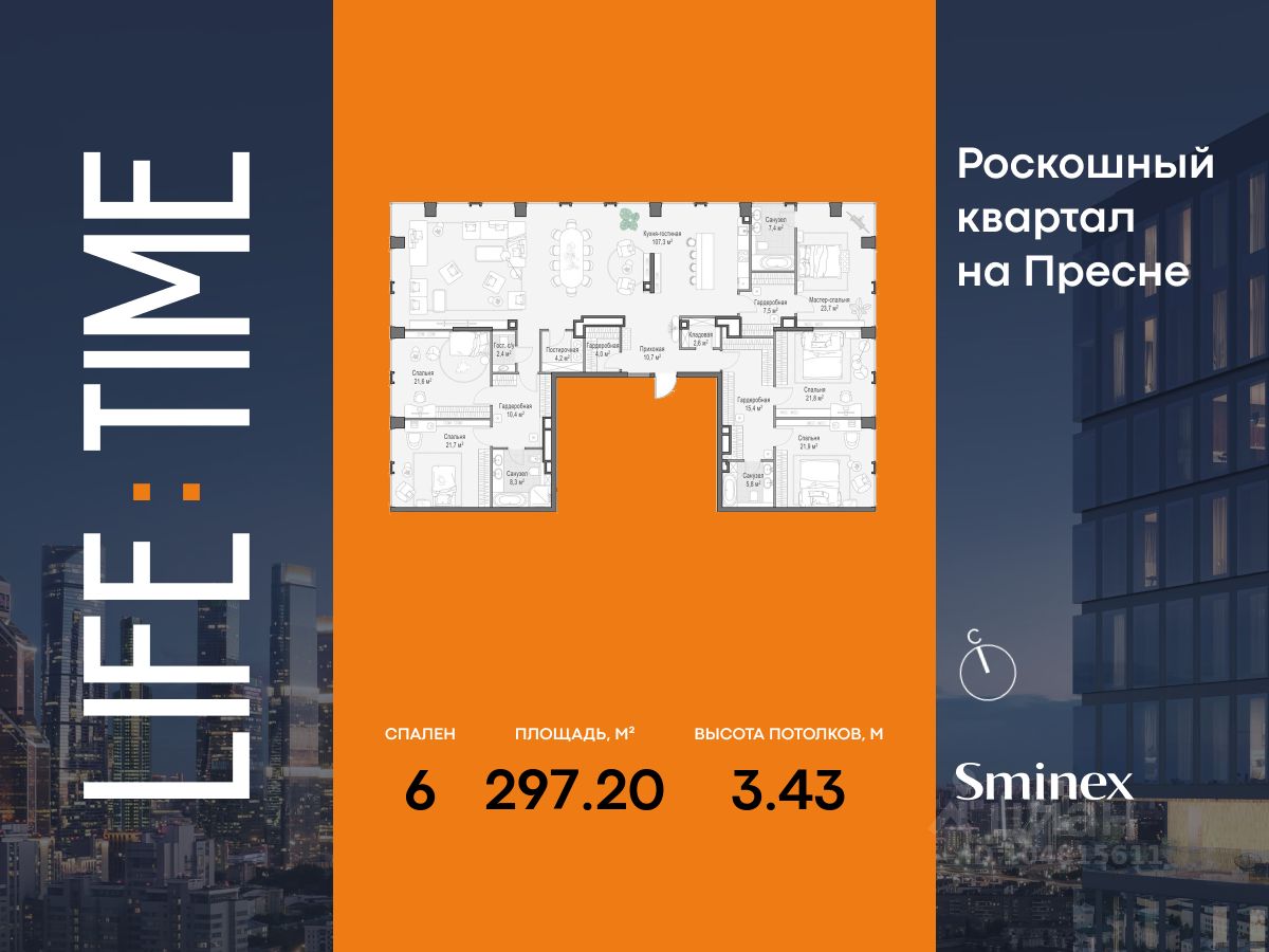 Life Time - роскошный современный квартал на Пресне, в наиболее быстро растущем премиальном районе ЦАО. Его насыщенная инфраструктура и выгодное расположение дарят время для жизни. Вы больше не тратите его на дорогу или ожидание, при этом ни в чём себе не отказывая. На территории предусмотрено всё для комфортной жизни: • двор-парк площадью 1,8 гектара с прудом и фонтанами; • Clubhouse - инфраструктурный центр в отдельном здании с исчерпывающими возможностями для спорта, отдыха и досуга только для жителей; • спортивная инфраструктура на улице и в помещении, в том числе бассейн длиной 25 метров, хот-таб, хаммам, сауна, бьюти-зона; • клубная гостиная с террасой; • всё для развития и досуга детей любого возраста, в том числе детский сад и школа. Life Time находится в центре сложившегося премиального района, в окружении многочисленных парков. Удобная транспортная доступность и прямой выезд на Звенигородское шоссе позволяют без проблем добраться до Садового кольца и Москва-Сити. Архитектурный стиль квартала - роскошный минимализм. Дома десятилетиями будут выглядеть современно. В Life Time представлен широкий выбор как квартир, так и особых форматов: двухэтажные пентхаусы с каминами и террасами, скай-виллы.