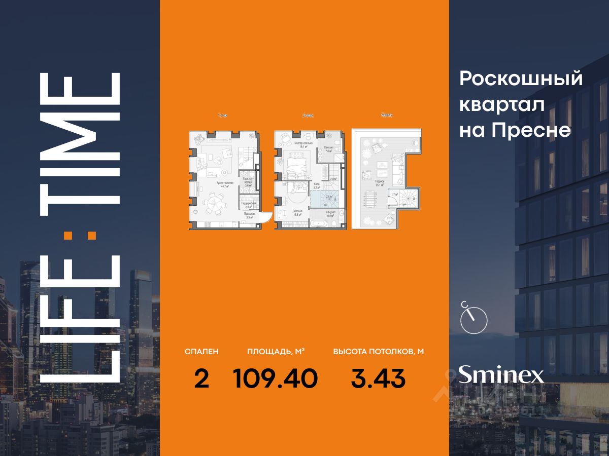 Двухэтажный пентхаус в Life Time в корпусе С с приватной террасой для тех, кто любит быть на расстоянии вытянутой руки от города, но на шаг выше суеты. Жизнь проходит на первом этаже пентхауса в просторной кухне-гостиной, отдых - на отдельном мастер-этаже, а кульминация дня - на террасе с завораживающими видами.