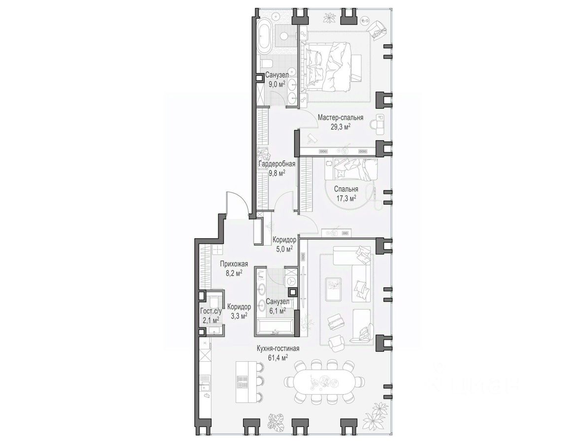 Просторная квартира площадью 152,4 кв. м. Из кухни-гостиной (41,2 кв. м) открывается панорамный вид на красивый двор-парк с ландшафтным дизайном и вечерней подсветкой. Продуманная планировка позволяет разместить три приватные спальни, в одной из которых, примыкающей к мастер-спальне, предусмотрен санузел с окном, что делает ваше личное пространство по-настоящему комфортным. Окна выходят на три стороны.
