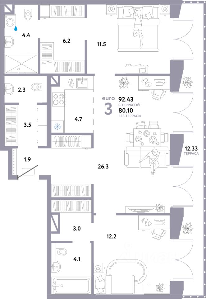 Продаётся 3-комнатная квартира в строящемся доме (Дом 1), срок сдачи: II-кв. 2026, общей площадью 92.43 кв.м., на 19 этаже. Многоэтажные жилые дома с объектами инфраструктуры, расположенные по адресу: г. Москва, внутригородское муниципальное образование Очаково - Матвеевское, ул. Озерная, вл. 42.
