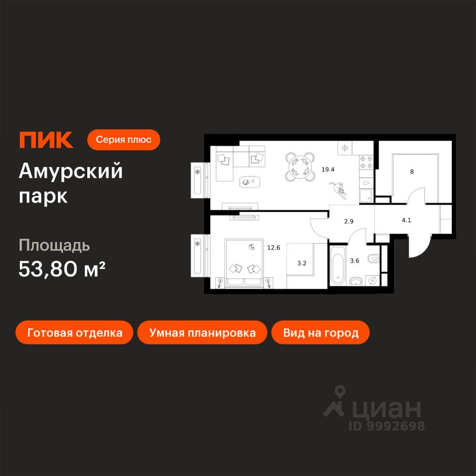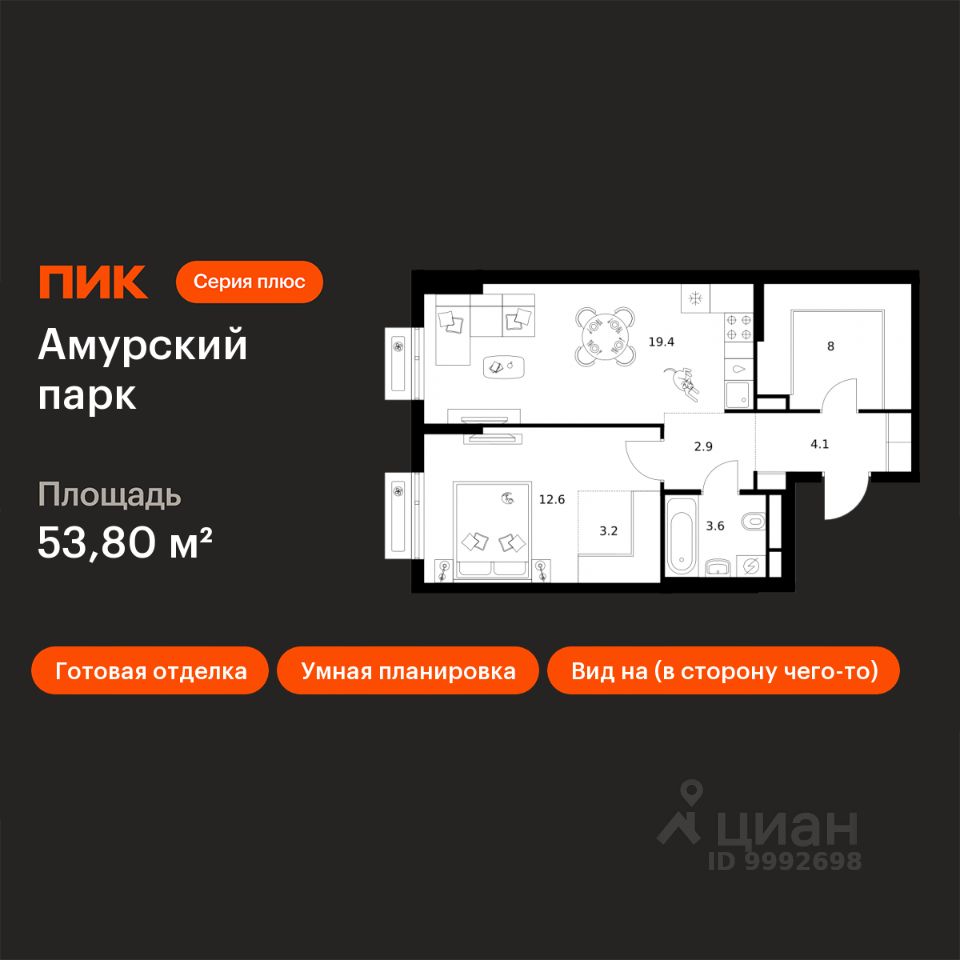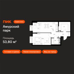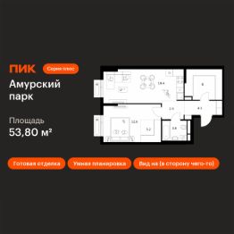 Продаётся 1-комн. квартира площадью 53,8 кв.м на 4 этаже 12 этажного дома (Корпус 4.2, Секция 2) проекта ПИК Амурский парк. Светлый просторный подъезд на уровне земли, функциональная планировка, большие окна, c отделкой.