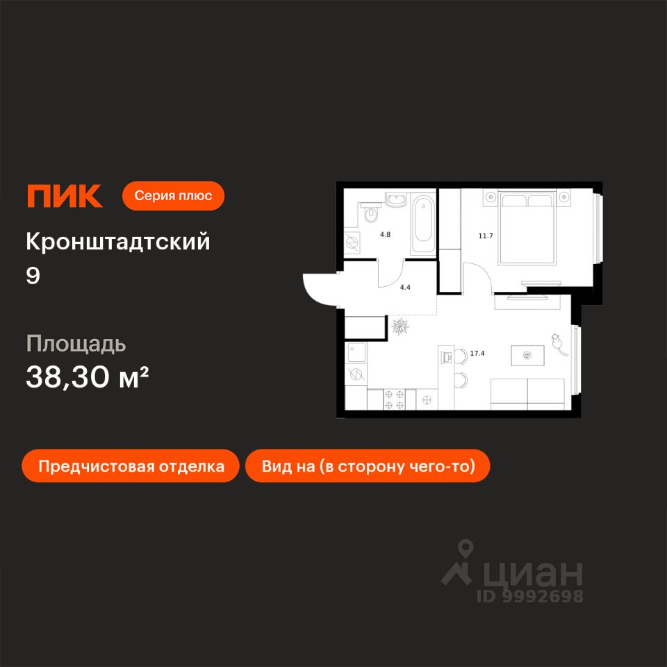 Продаётся 1-комн. квартира площадью 38,3 кв.м на 11 этаже 12 этажного дома (Корпус 1.1.2, Секция 2) проекта ПИК Кронштадтский 9. Светлый просторный подъезд на уровне земли, функциональная планировка, большие окна, предчистовая отделка.