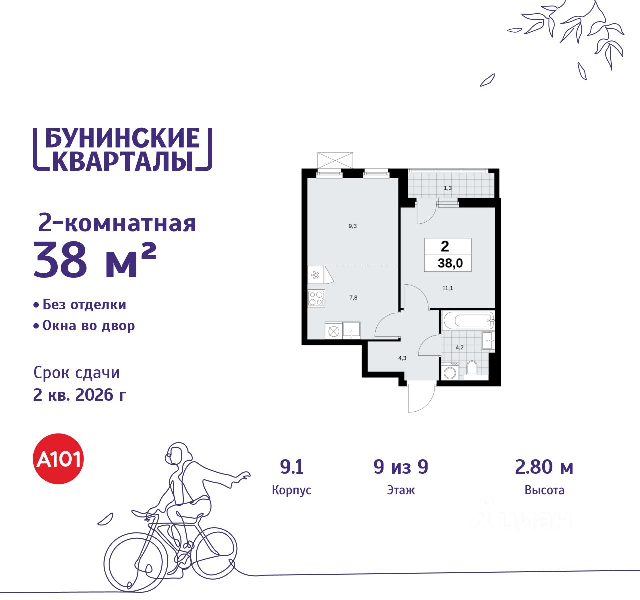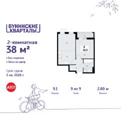 Продается двухкомнатная квартира 300 в новостройке ЖК "Бунинские кварталы" по адресу Москва, ТиНАО, Новомосковский АО, Сосенское С/П, жилой комплекс Бунинские Кварталы, 9.1, район Коммунарка, Новомосковский административный округ, Москва. Общая площадь квартиры - 38.00 кв. м., этаж 9 из 9, секция 4. Тип проекта, по которому построен дом - монолит, компания-застройщик - ООО "А101". Стоимость квартиры - 13953220 Р. Срок сдачи - 1 квартал 2026.