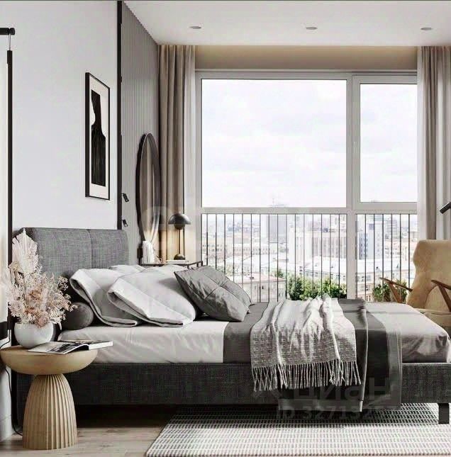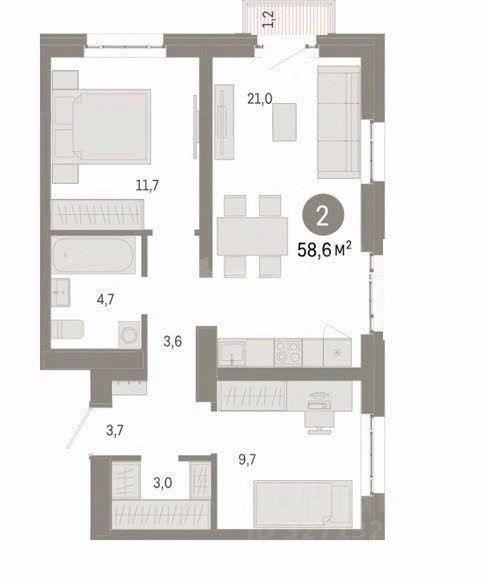 Отделка white box. Панорамные окна. Два раздельных санузла. Планировка: кухня-гостиная — 21 м², спальни — 9,7 м² и 11,7 м². Полноценный балкон.