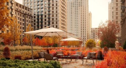 Двор без автомобилей. Зоны для игр, спорта, отдыха и пикников. Ландшафтное озеленение.