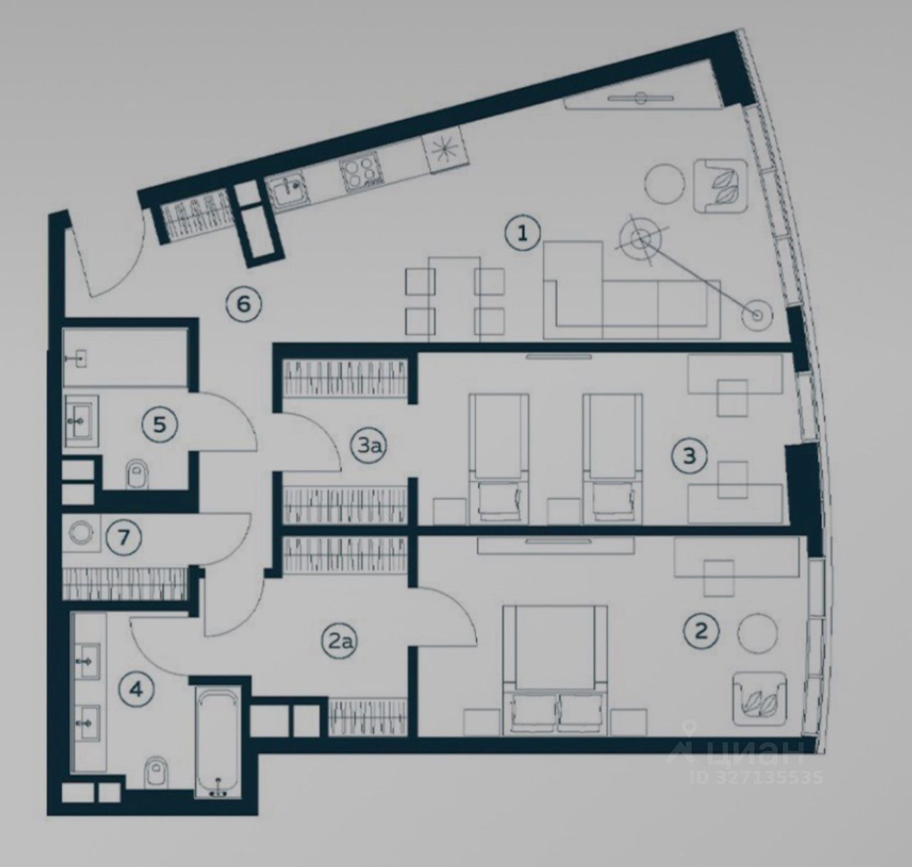 две спальни 21кв.м. - 26кв.м. одна из которых мастер - спальня со своим санузлом и вместительной гардеробной.