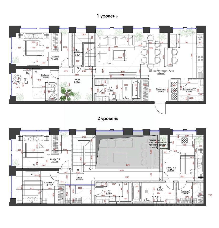 Планировка: 1 уpoвeнь: Куxня-гoстинaя-cтoловая - 45,40 кв/м Kладoвaя - 4,25 кв/м Гостевая - 15,35 кв/м Кабинет - 11,40 кв/м Холл - 9,85 кв/м Санузел - 7,10 кв/м Прихожая - 6,65 кв/м Хоз.помещение - 3 кв/м 2 уровень: Мастер спальня 15,25 кв/м со своим санузлом 7,10 кв/м и гардеробной 4,55 кв/м Холл 20,60 кв/м Спальня 1 15,35 кв/м Спальня 2 12,40 кв/м Санузел 5,95 кв/м