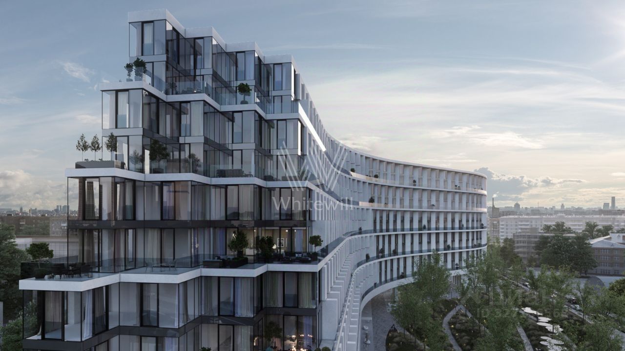 Главное о доме. Архитектура в форме волны из белоснежного бетона и приватный ландшафтный парк с дорожками, подсвеченными по вечерам. Вы проводите утро на террасе своей квартиры с видом на реку, а после работы спускаетесь в спа-зону или играете партию в интерактивный гольф с соседом. Зимой катаетесь на катке во дворе, а летом ваши дети играют на площадке в форме жемчужины, спрятанной в тени деревьев. В выходной можно посетить мини-кинотеатр или кабинет косметологии, не покидая пределов комплекса.