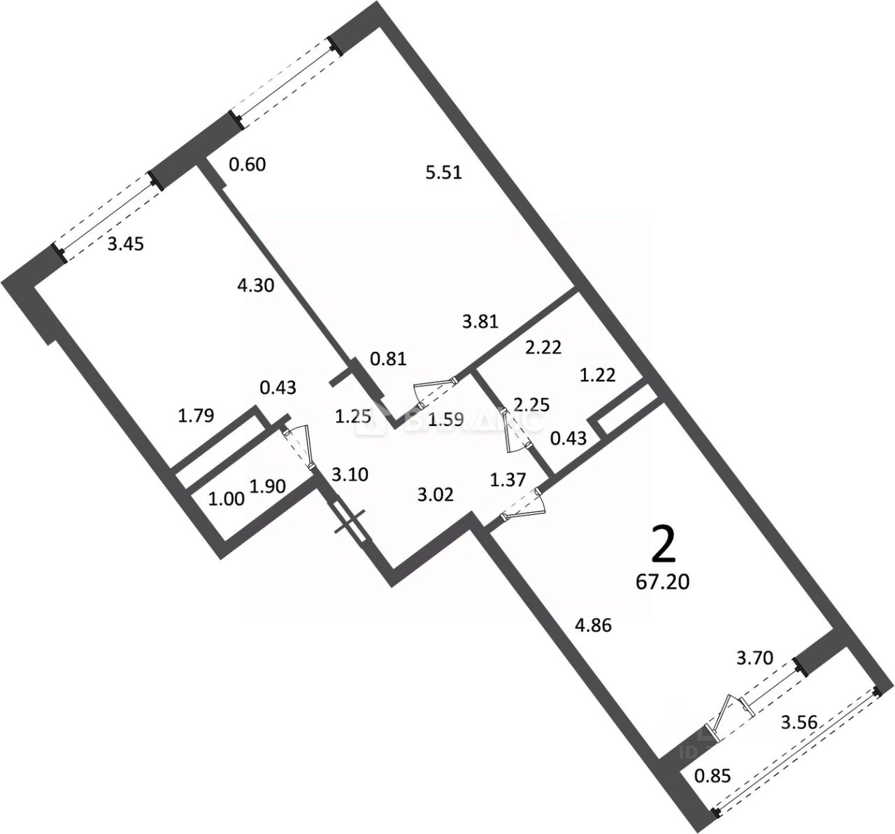 Квартира расположена на 5 этаже пятиэтажного кирпично-монолитного дома, построенного в 2024 году. Общая площадь составляет 67,2 кв. м, из которых 38,7 кв. м — жилая площадь, 14,8 кв. м — кухня. Высота потолков — 2,7 м.