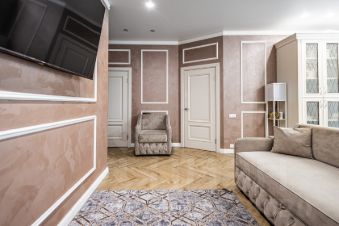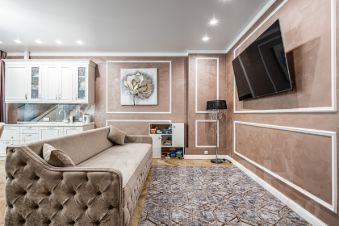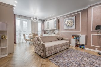 В квартире сделан дизайнерский ремонт из дорогих импортных материалов, полностью укомплектована всей бытовой встроенной техникой.