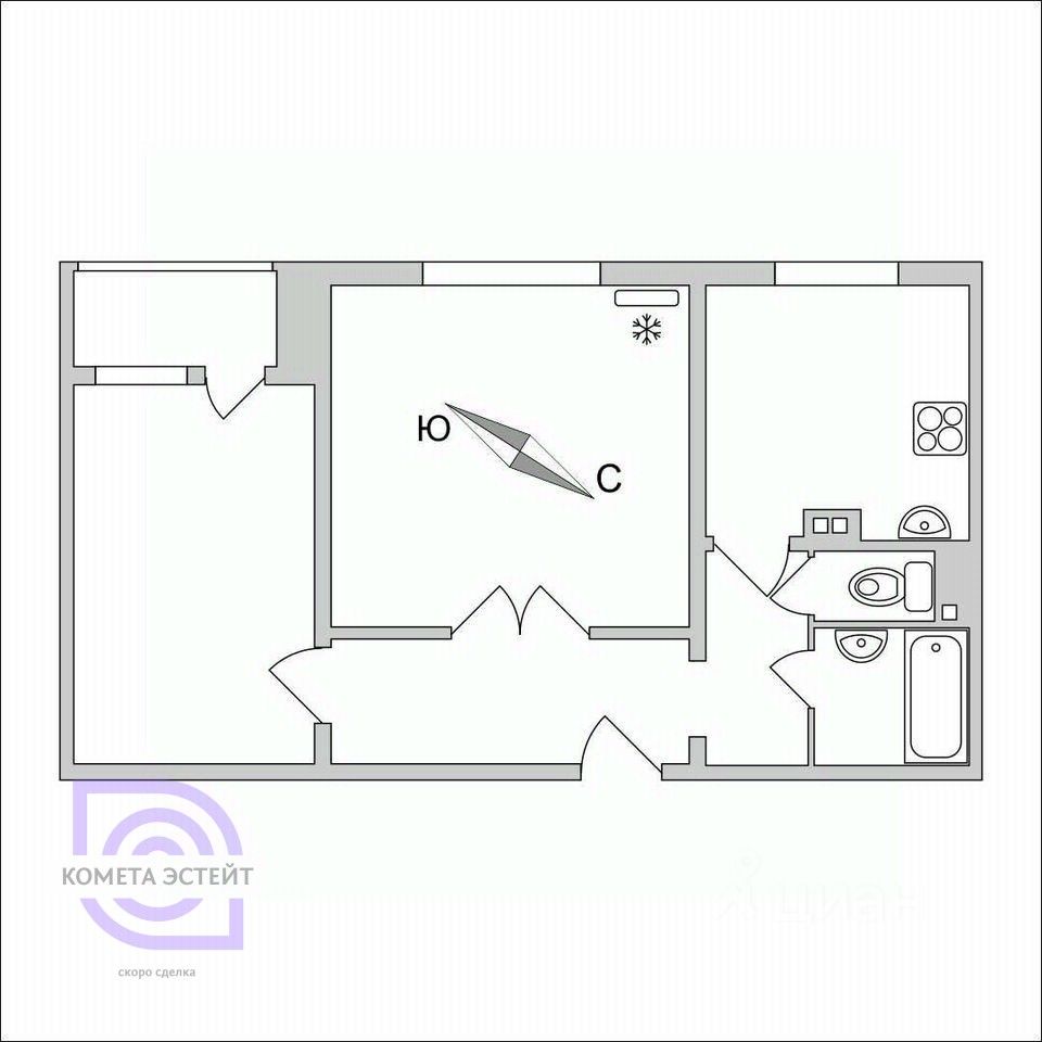 Общая площадь — 52.1 кв. м, жилая — 30,2 кв. м (17,1 + 13,1), кухня — 8,6 кв. м. Высота потолков — 2,6 м.