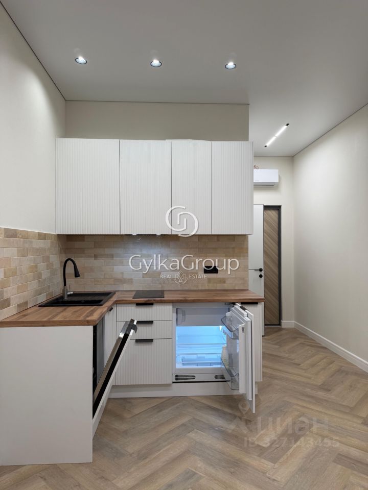 В студии продумана планировка, полноценный санузел, кухня с посудомойкой и встроенным холодильником под столешницу, хороший вид в сторону автомобильного проезда.