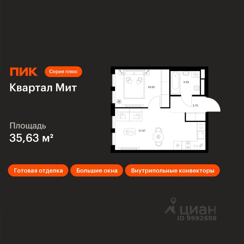 Новостройка! Продается 1-комн. кв-ра площадью 35,63 кв.м, (Корпус 3.6, Секция 7) 5 этаж 15-этажного дома в Квартал Мит от ПИК. "Квартал Мит" строится в экологически чистом районе Митино, где по соседству расположен большой лесопарк, а с двух сторон протекают реки Сходня и Журавка. Для семей с детьми здесь появится школа и два детских сада.