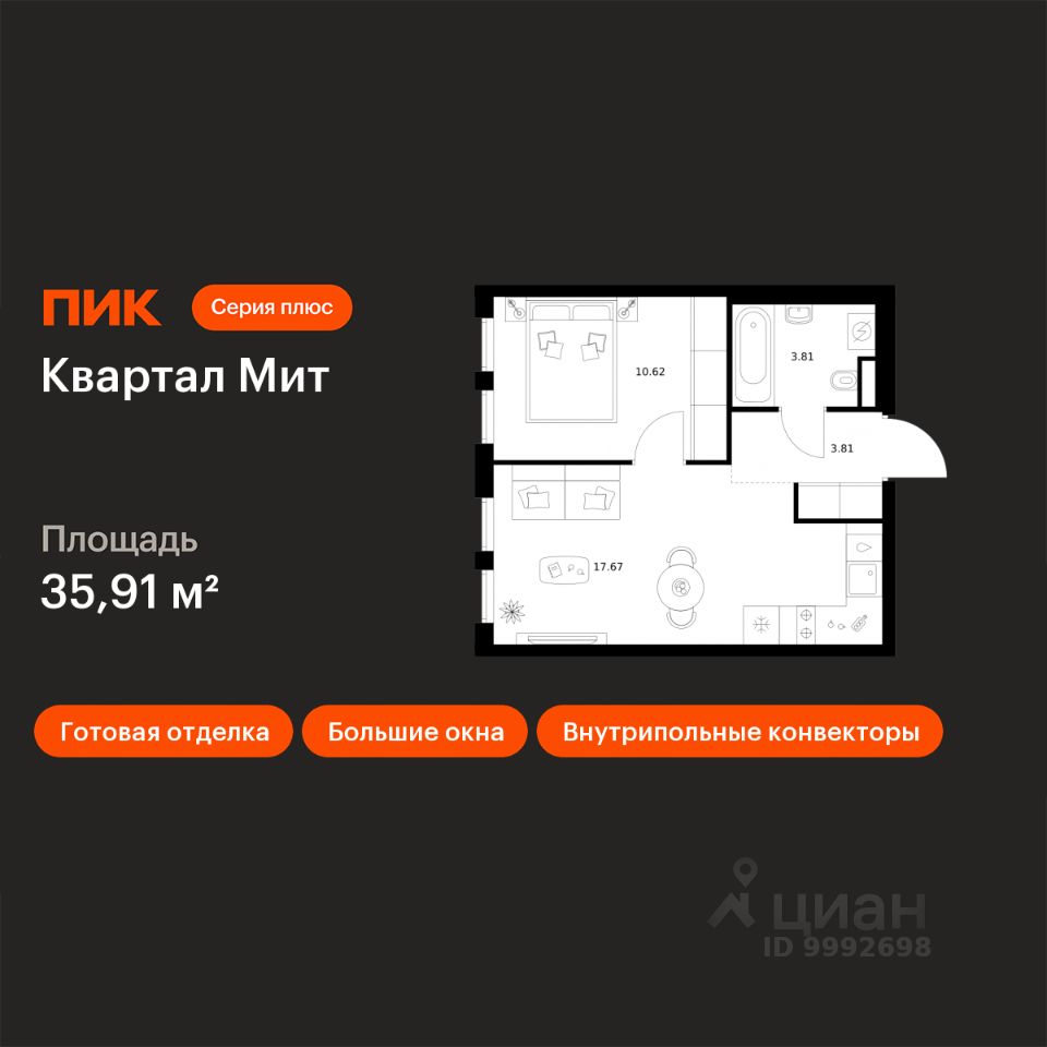 Новостройка! Продается 1-комн. кв-ра площадью 35,91 кв.м, (Корпус 3.6, Секция 7) 6 этаж 15-этажного дома в Квартал Мит от ПИК. "Квартал Мит" строится в экологически чистом районе Митино, где по соседству расположен большой лесопарк, а с двух сторон протекают реки Сходня и Журавка. Для семей с детьми здесь появится школа и два детских сада.