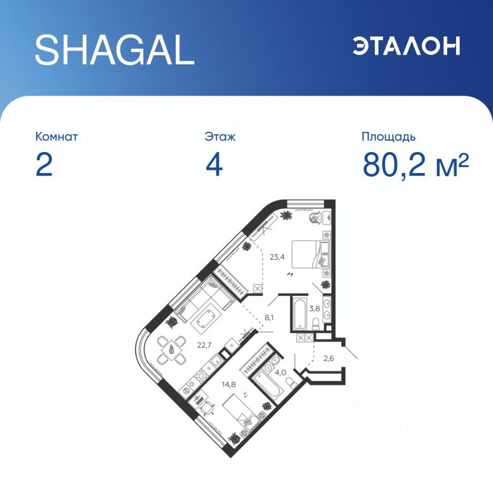 Общая площадь квартиры — 80.2 кв. м, этаж 4 из 11.