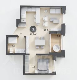 Функциональная планировка: кухня - гостиная (16,7 м) + мастер спальня (13,8 м) + кабинет (10,6 м).
