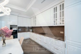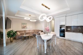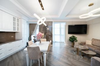 Интерьер выполнен в изысканном стиле современной классики, подчёркивая вкус и статус владельца жилья.