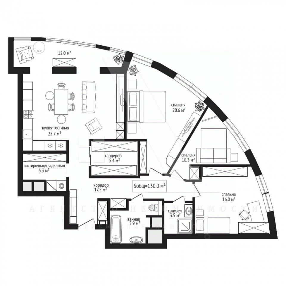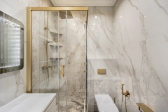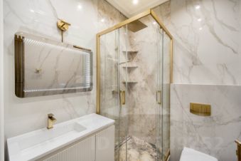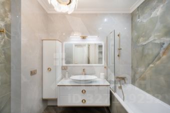 Два просторных санузла оборудованы всеми необходимыми удобствами: в первом находится ванна, второй оборудован удобной душевой кабиной. Квартира оснащена помещением-постирочной и гладильной зоной со встроенными шкафами для хранения хозяйственных принадлежностей. Просторная гардеробная обеспечит дополнительное пространство для хранения вещей.