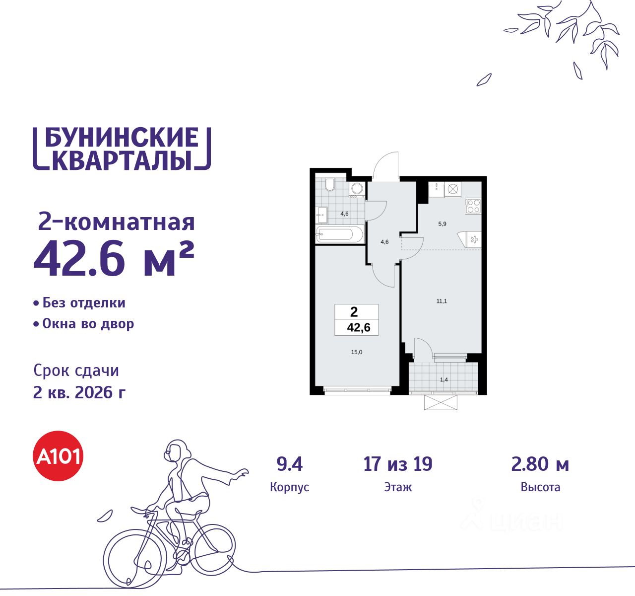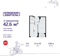 Продается двухкомнатная квартира 990 в новостройке ЖК "Бунинские кварталы" по адресу Москва, ТиНАО, Новомосковский АО, Сосенское С/П, жилой комплекс Бунинские Кварталы, 9.4, район Коммунарка, Новомосковский административный округ, Москва. Общая площадь квартиры - 42.60 кв. м., этаж 17 из 19, секция 10. Тип проекта, по которому построен дом - монолит, компания-застройщик - ООО "А101". Стоимость квартиры - 14983698 Р. Срок сдачи - 1 квартал 2026.