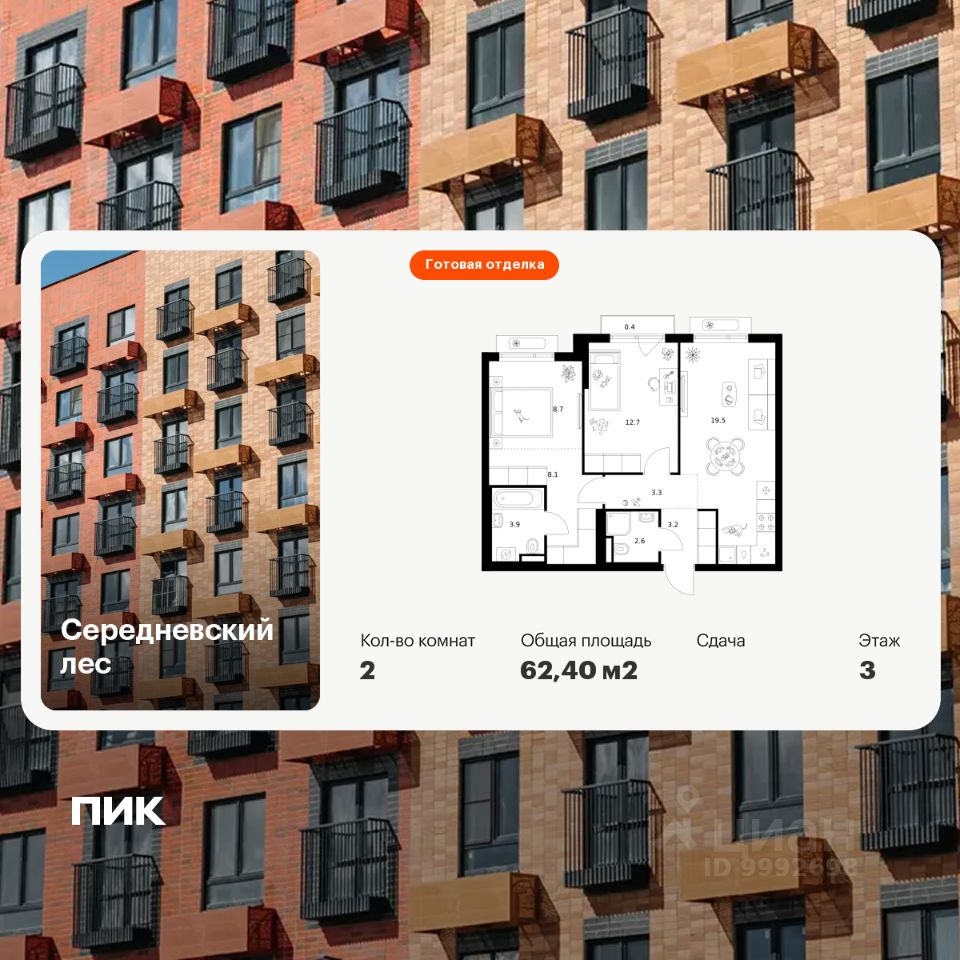 Продаётся 2-комн. квартира площадью 62,4 кв.м на 8 этаже 16 этажного дома (Корпус 2.1.4, Секция 4) проекта ПИК Середневский лес. Светлый просторный подъезд на уровне земли, функциональная планировка, большие окна, c отделкой.