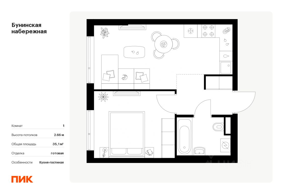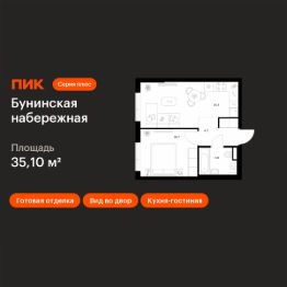 Продаётся 1-комн. квартира площадью 35,1 кв.м на 7 этаже 16 этажного дома (Корпус 2.6/1.3, Секция 3) проекта ПИК Бунинская набережная. Светлый просторный подъезд на уровне земли, функциональная планировка, большие окна, c отделкой.