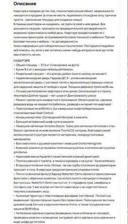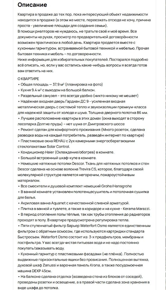 В помощи риелторов не нуждаюсь, не тратьте своё и моё время. Все документы на руках, просмотр по предварительной договорённости возможен практически в любой день. Квартира продается вместе с кухонным гарнитуром, встраиваемой бытовой техникой и мебелью. Прочая бытовая техника и мебель по договоренности.