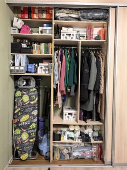 • На балконе сделана отделка (возведена стена из блоков от соседей), проведены розетки и освещение, а в правой части сделана зона хранения в виде шкафа до потолка.