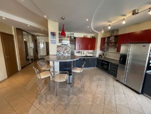Кухня (16м) полностью экипирована всем необходимым: Мебель Дарина по индивидуальному заказу; Холодильники NorCool(Норвегия) и Maytag (США); кухонная техника Miele (Германия) измельчитель пищевых отходов в раковине insink erator Bone Crasher(США); барная стройка и все горизонтальные поверхности сделаны из искуственного камня. Пол - керамогранит с электроподогревом.