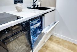 Кухня: встроенный гарнитур с посудомоечной машиной, варочной поверхностью, духовым шкафом, микроволновой печью, холодильником