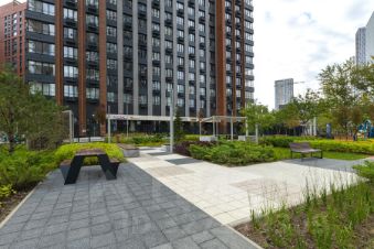 Современная архитектура, закрытый двор без машин с зонами отдыха, спортивными площадками и детскими игровыми зонами.